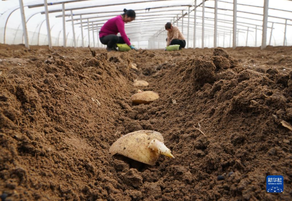 2月8日,河北省秦皇岛市昌黎县马坨店乡东赵庄村的农民在大棚内播种马铃薯。