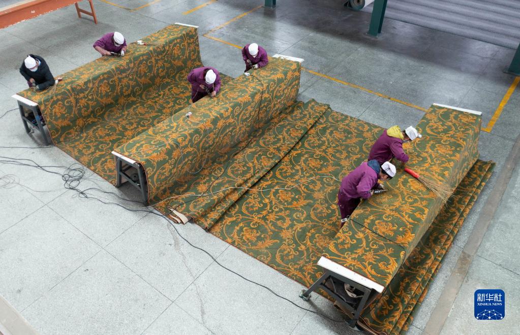 在青海省西宁市圣源地毯集团有限公司生产车间,操作工在为地毯剪花(2月4日摄)。