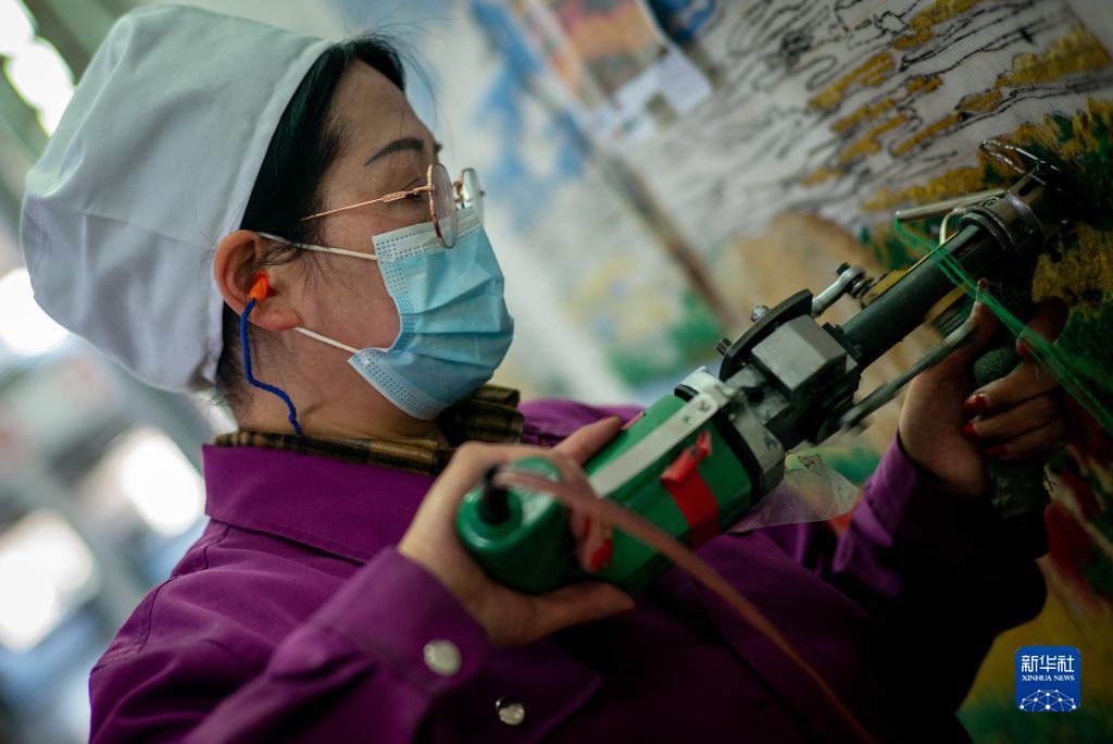 操作工在青海省西宁市圣源地毯集团有限公司生产车间使用枪刺工艺制作地毯(2月4日摄)。