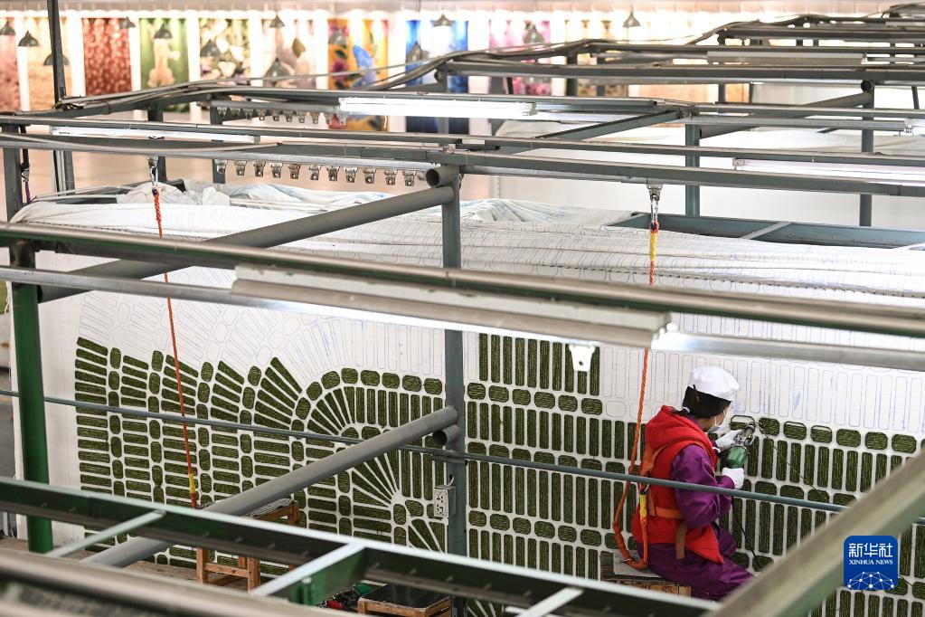 一位女工在圣源地毯集团有限公司生产车间使用枪刺工艺制作地毯(2月1日摄)。