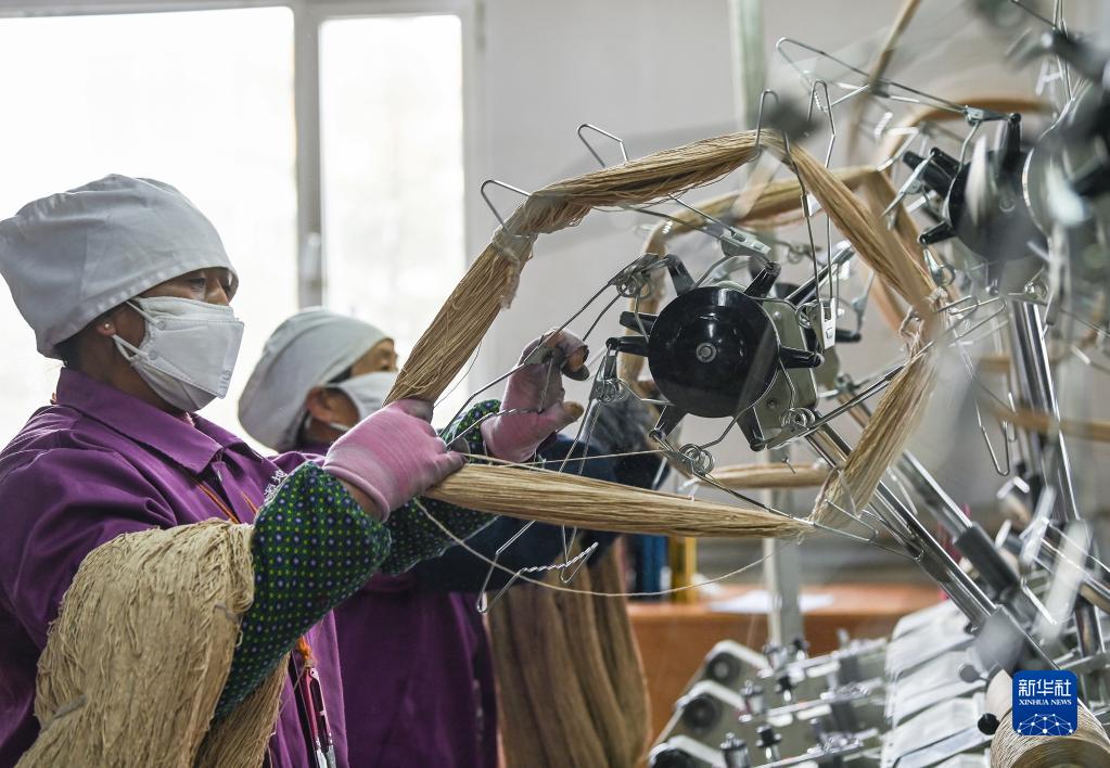 女工们在圣源地毯集团有限公司生产车间络筒(2月1日摄)。