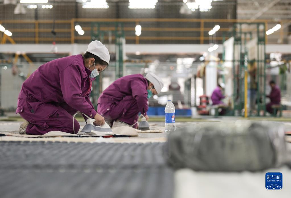 女工们在圣源地毯集团有限公司生产车间进行地毯加工(2月4日摄)。