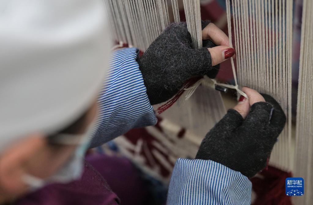 一位女工在圣源地毯集团有限公司生产车间手工编织地毯(2月4日摄)。