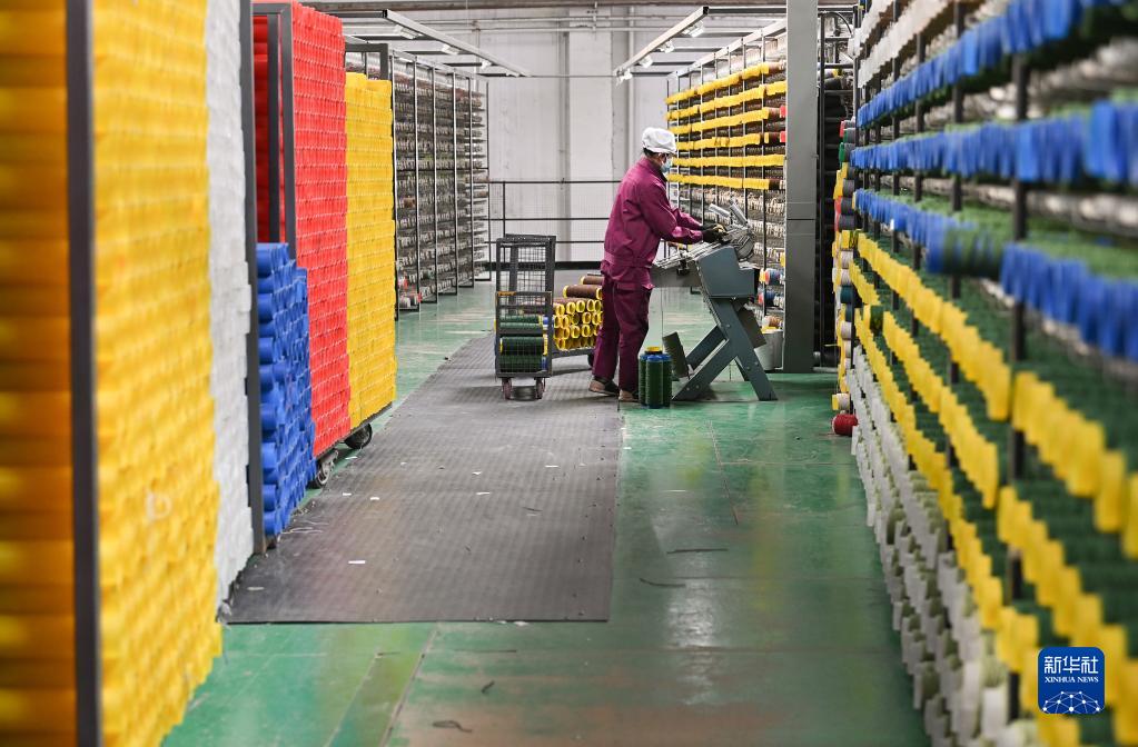 一位女工在圣源地毯集团有限公司生产车间检查纱线筒(2月1日摄)。