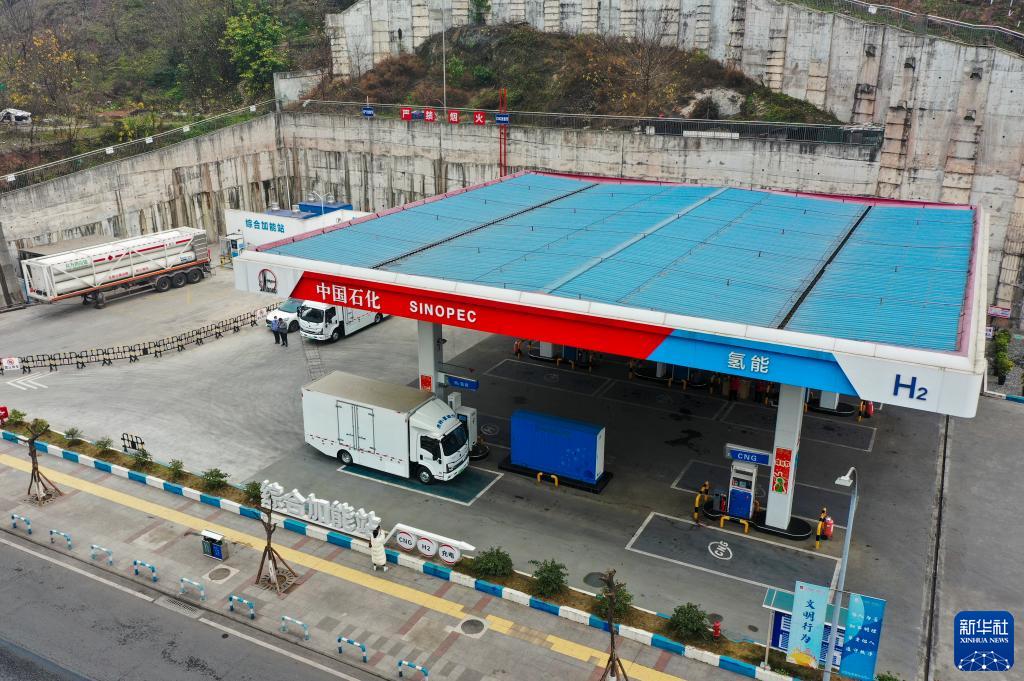 2月8日,在位于九龙坡区的重庆首座加氢站内,一辆庆铃汽车(集团)有限公司生产的氢动力商用车正在加氢(无人机照片)。