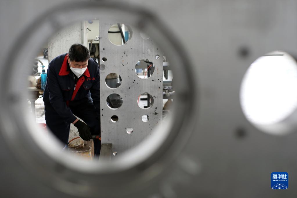 2月9日,在沧州市东光县一纸箱机械公司,工作人员在组装纸箱包装全自动生产线横切机设备。