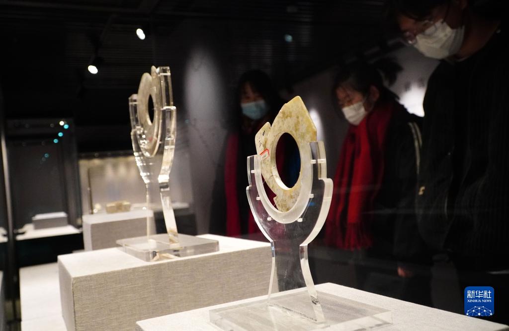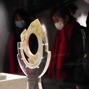 2月9日,在孔子博物馆举行的山东文物精品展上,参观者在观看五莲县博物馆收藏的龙山文化玉璇玑。