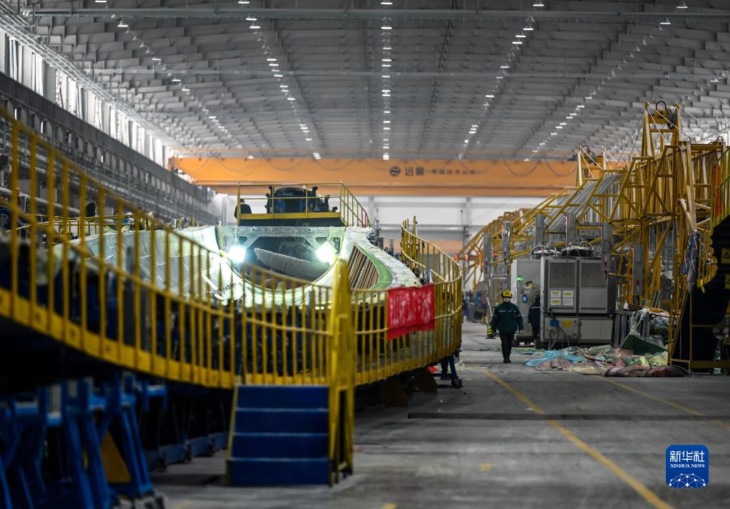 2月9日,在内蒙古乌兰察布市远景北方能源有限公司,工人在风机叶片生产线上工作。
