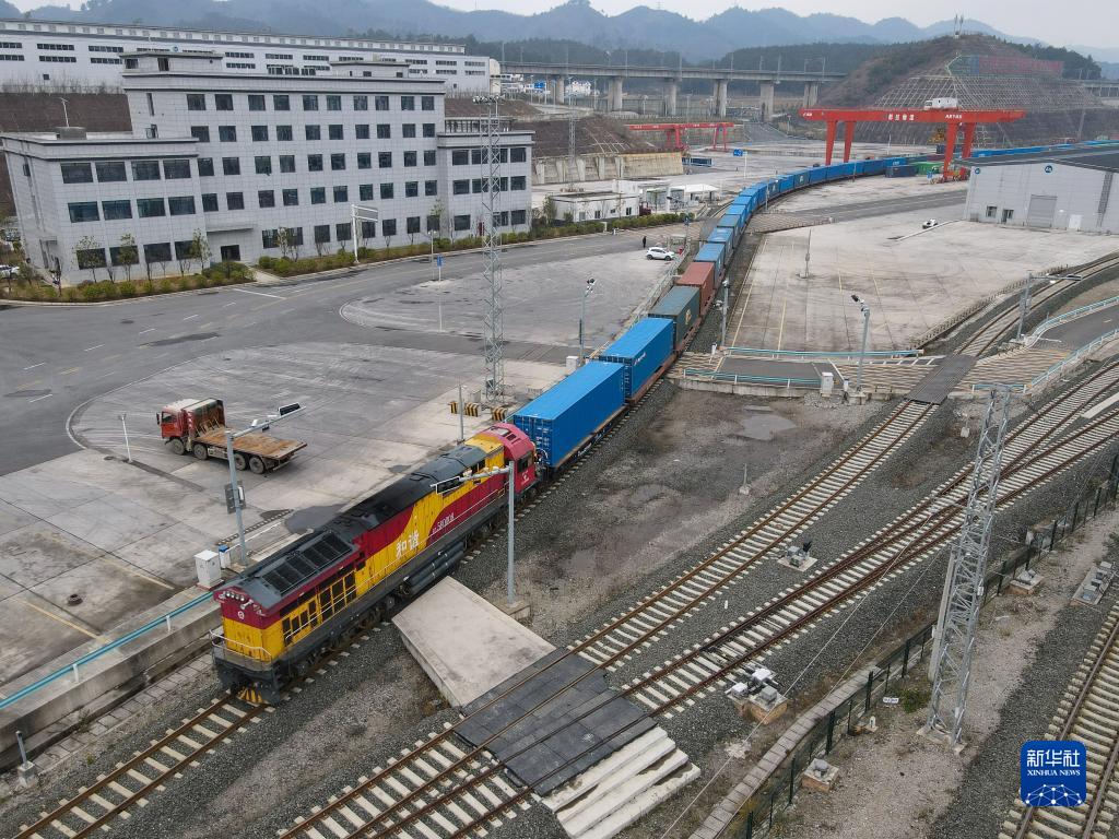 2月9日,一列中欧班列开出贵阳国际陆港都拉营站(无人机照片)。