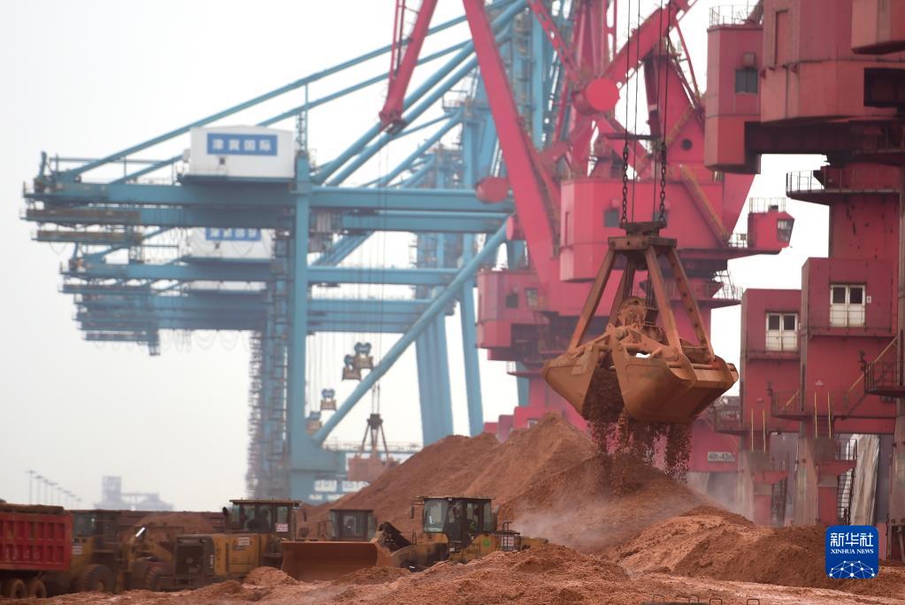 2月9日,卸船机在黄骅港矿石码头卸载铁矿粉。