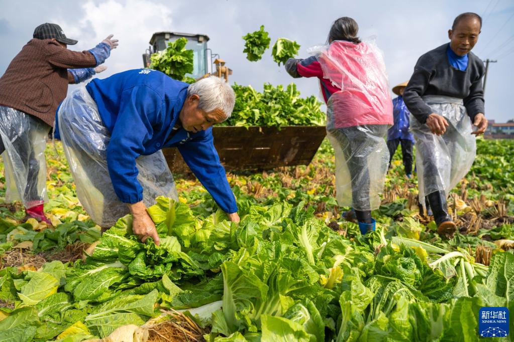 2月9日,在四川省眉山市彭山区公义镇欣荣村,村民们在采收蔬菜。