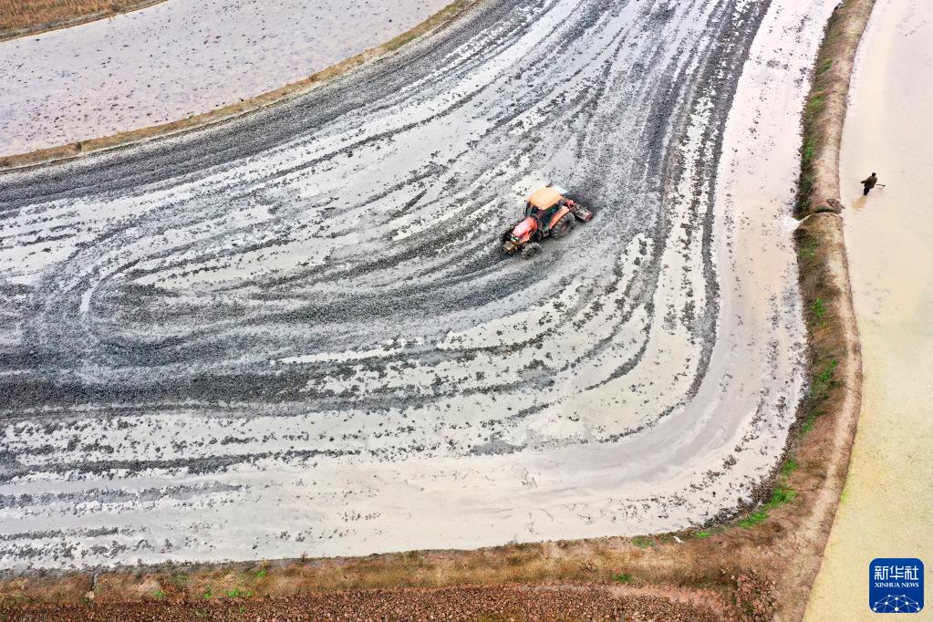 2月9日,四川省广安市广安区花桥镇三黎村的农民在驾驶农机犁田(无人机照片)。