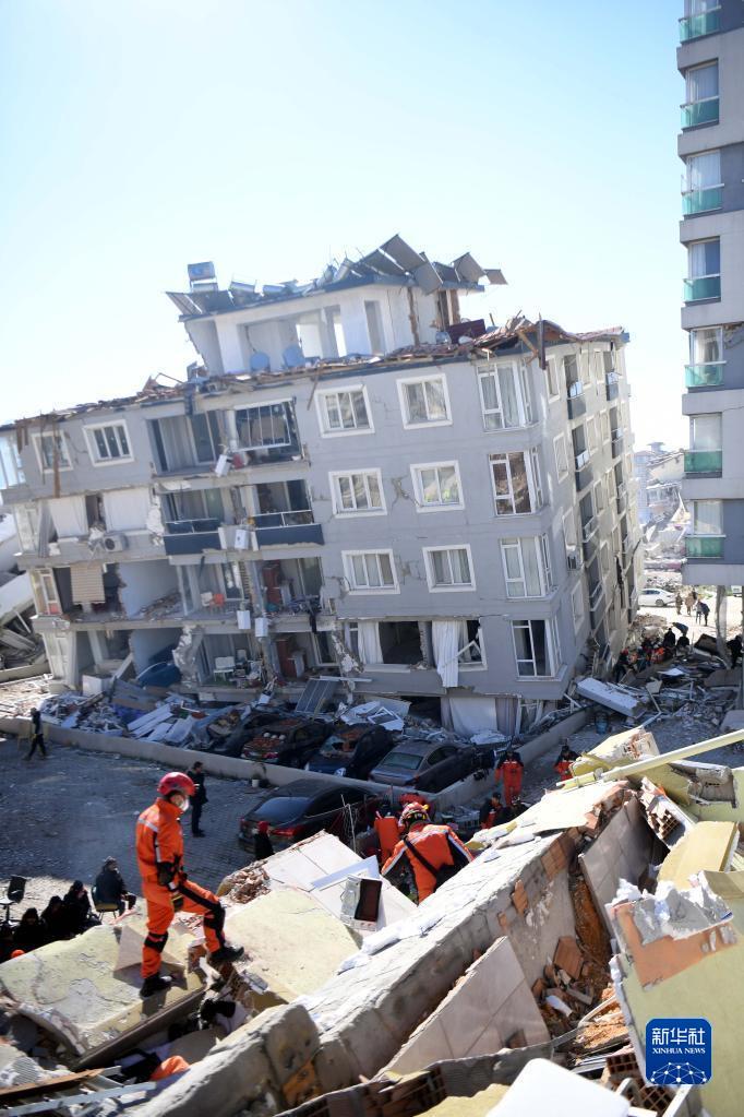 2月9日,中国救援队队员在土耳其哈塔伊省安塔基亚市的受损建筑上开展救援工作。