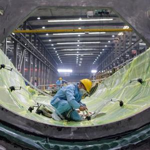 2月9日,工人在株洲时代新材料科技股份有限公司蒙西分公司风力发电叶片生产车间内作业。