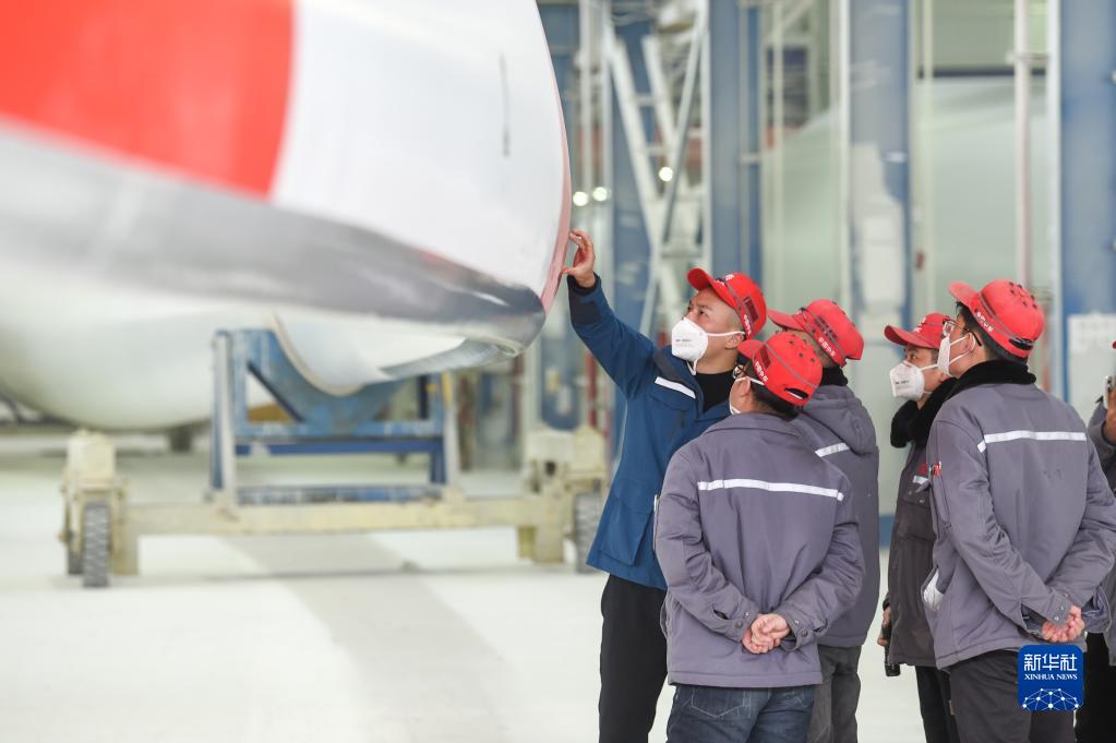 2月9日,工人在株洲时代新材料科技股份有限公司蒙西分公司风力发电叶片生产车间内检查风力发电叶片。