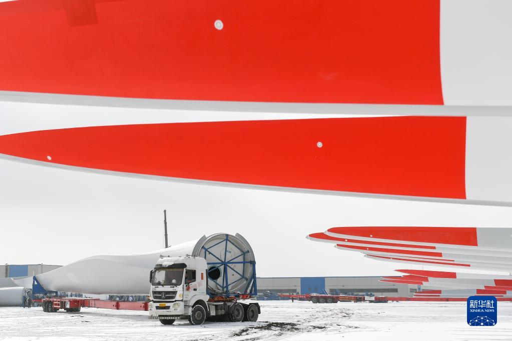 2月9日,车辆在株洲时代新材料科技股份有限公司蒙西分公司内运输风力发电叶片。
