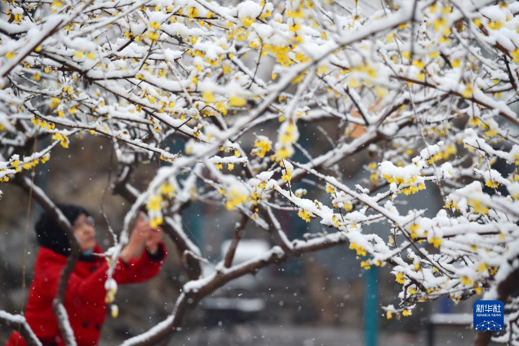 2月9日,石家庄市平安公园腊梅园,市民欣赏拍摄雪中腊梅。