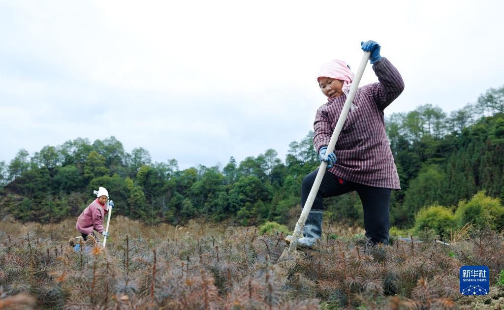 2月9日,农民在湖南省怀化市通道侗族自治县菁芜洲镇江口村杉树育苗基地挖树苗。