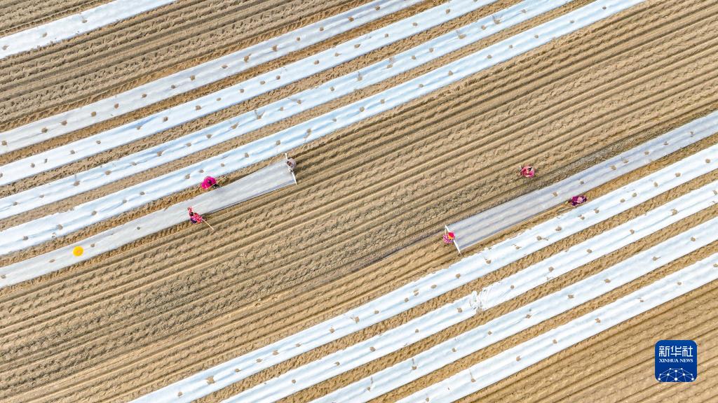 2月9日,农户在四川省射洪市沱牌镇龙泉村的地里盖膜(无人机照片)。