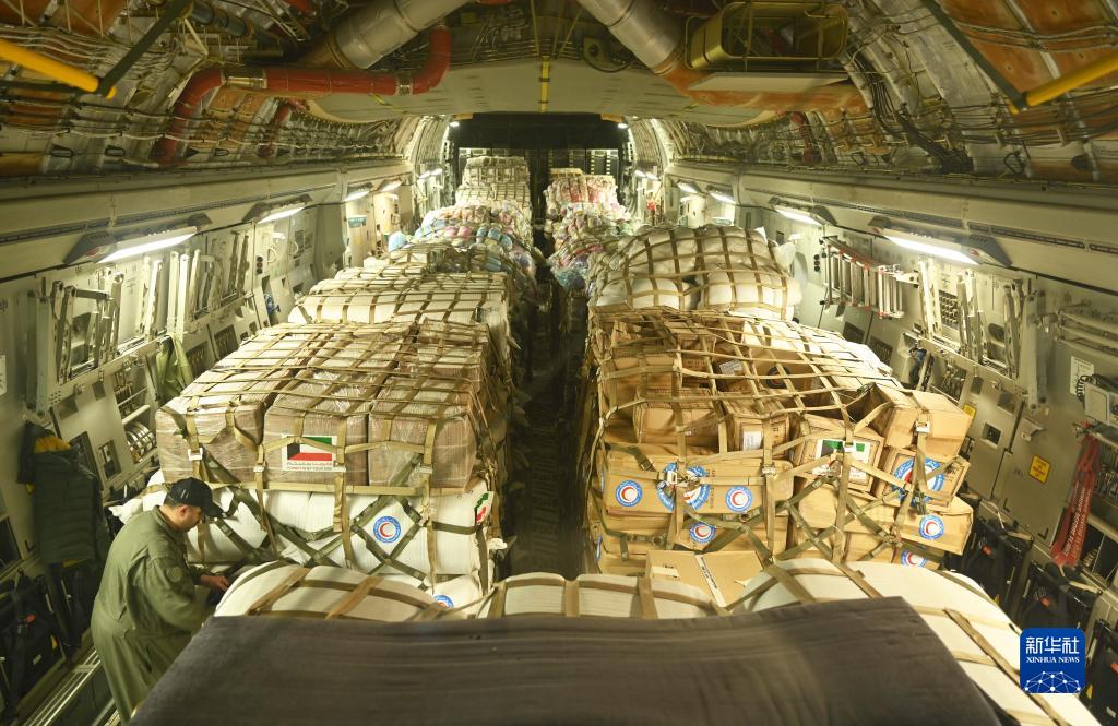 这是2月9日在科威特费尔瓦尼耶省的科威特国际机场拍摄的装载完成的人道主义援助物资。