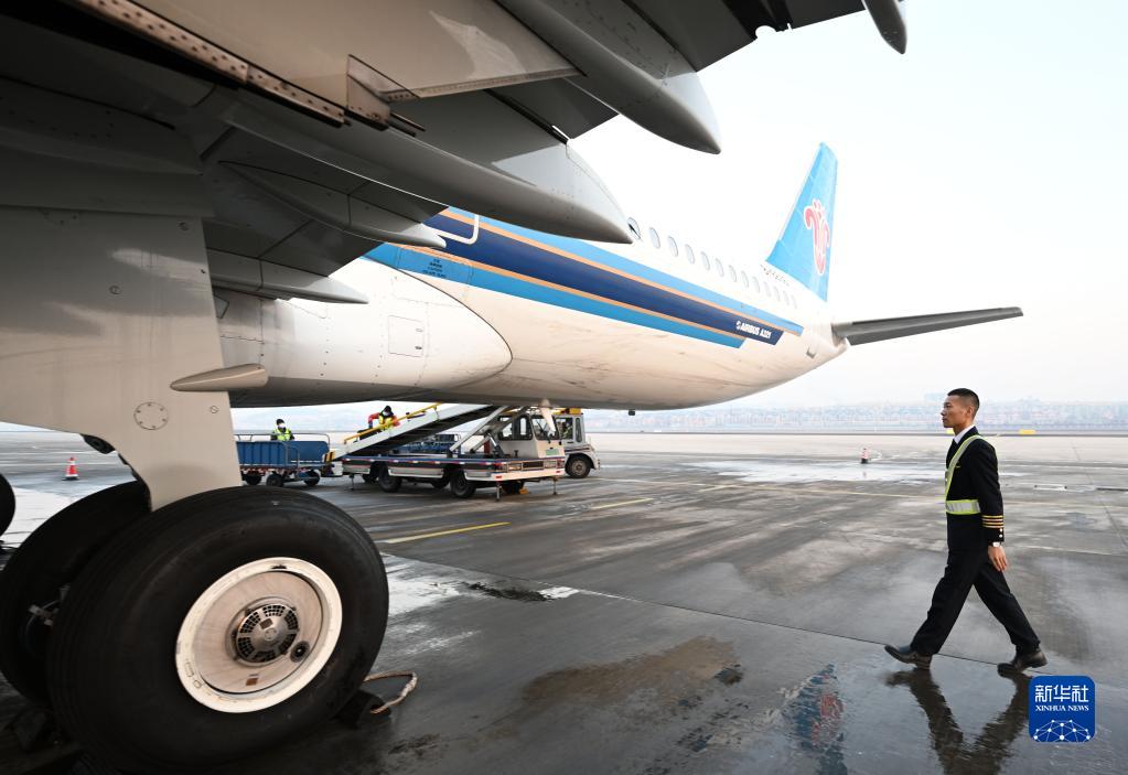 马保利在航班起飞前绕机巡检(2月4日摄)。
