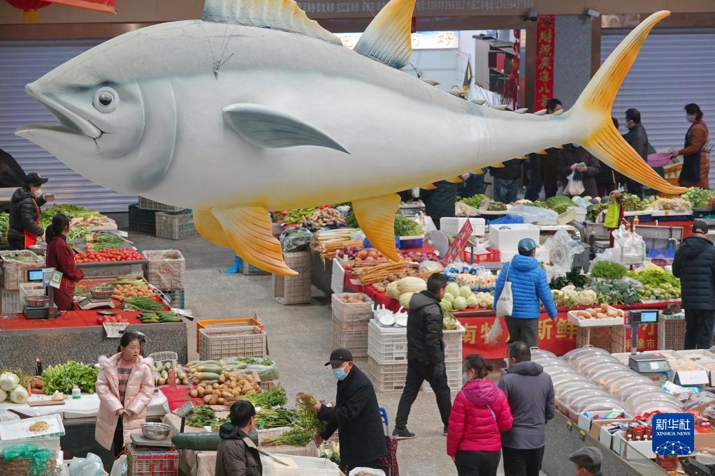 2月10日,市民在山东省烟台市红利市场买菜。