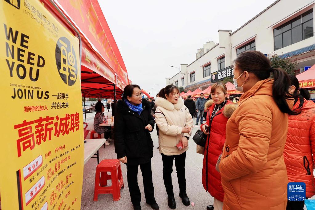 2月10日,在广西融安县易地扶贫安置点融康社区,求职者和招聘人员在交流。
