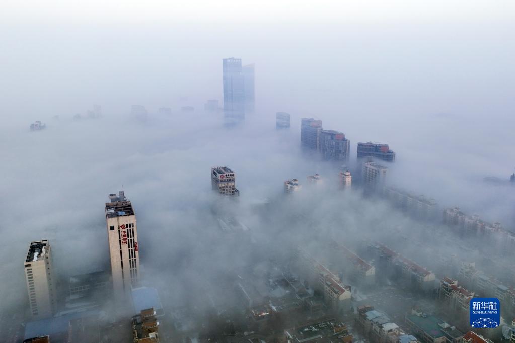 2月10日,俯瞰平流雾中的宁夏银川市城区建筑群(无人机照片)。