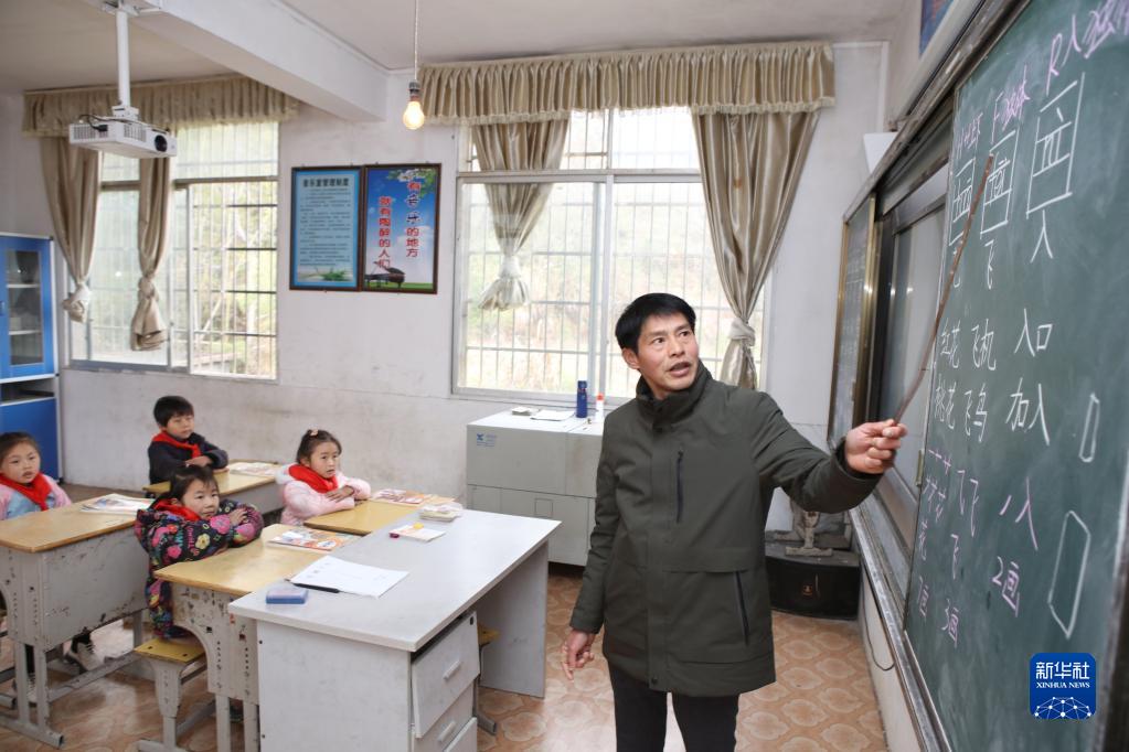 在楠木乡官溪小学,赖小田给孩子们上语文课(2月7日摄)。