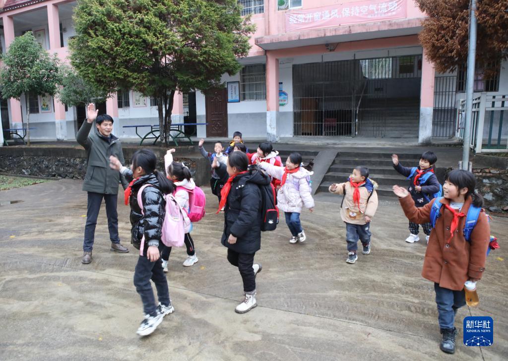 在楠木乡官溪小学,学生们放学后向赖小田挥手告别(2月7日摄)。