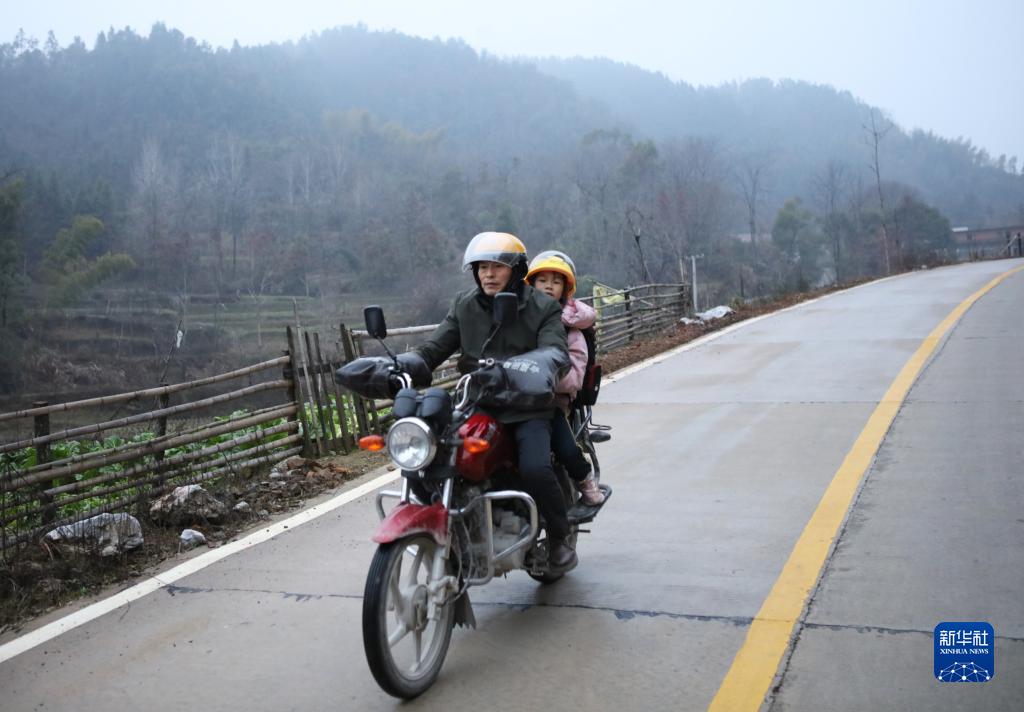 在楠木乡官溪小学外的山路上,赖小田骑摩托车送家离学校较远的学生陈玉婷回家(2月7日摄)。
