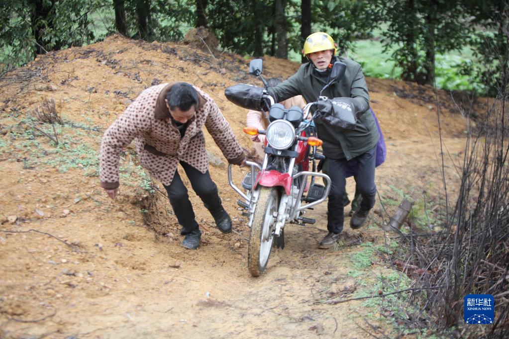在前往家访的路上,村民帮赖小田推车上一段陡坡(2月9日摄)。