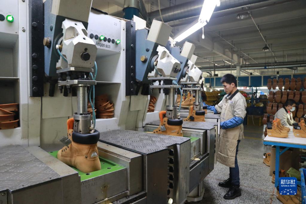 2月10日,工人在山东省高密市朝阳街道一家制鞋企业的车间内忙碌。
