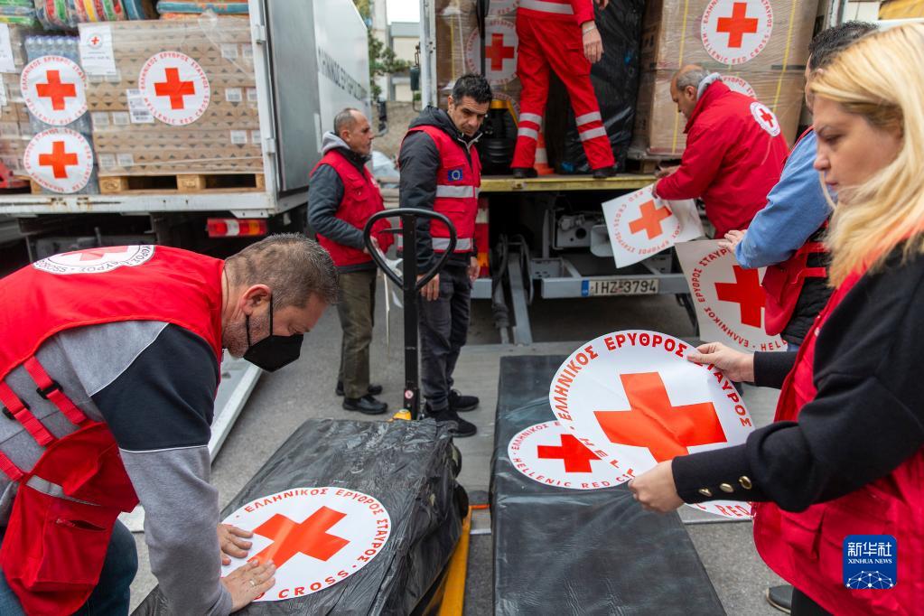 2月10日,红十字会工作人员在希腊雅典准备将救援物资装车。