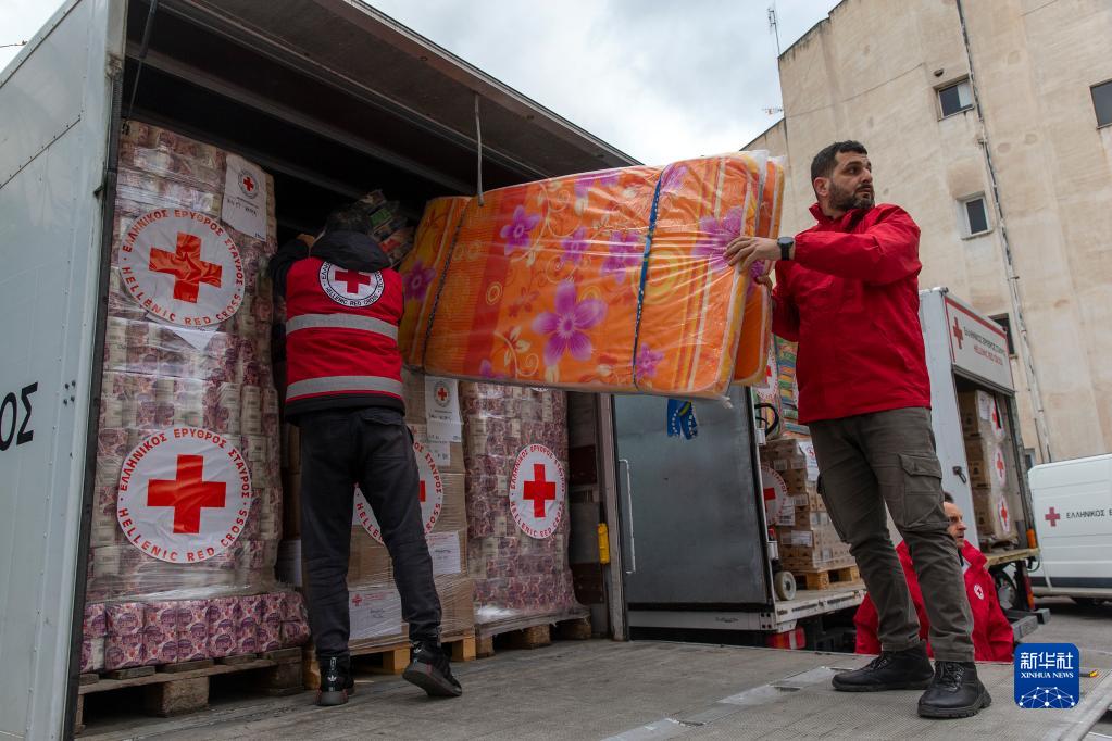2月10日,红十字会工作人员在希腊雅典将救援物资装车。