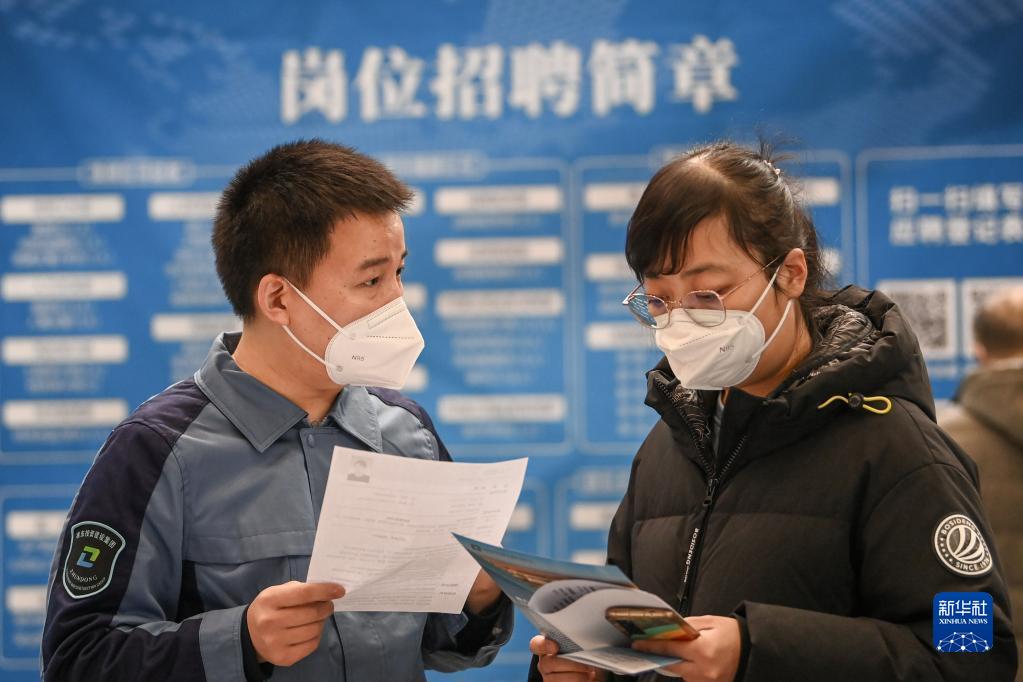 2月11日,在新疆国际会展中心举行的2023新疆春季人才交流会上,招聘人员与求职者(右)交流岗位信息。