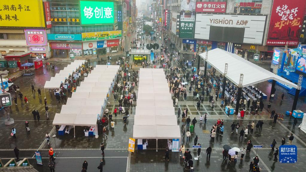 这是位于长沙市天心区黄兴南路步行街的招聘活动现场(2月11日摄,无人机照片)。