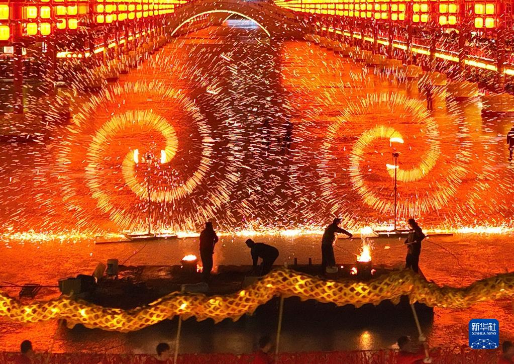 2月4日晚,河北省唐山市丰南区河头老街景区火树银花,耀眼夺目。