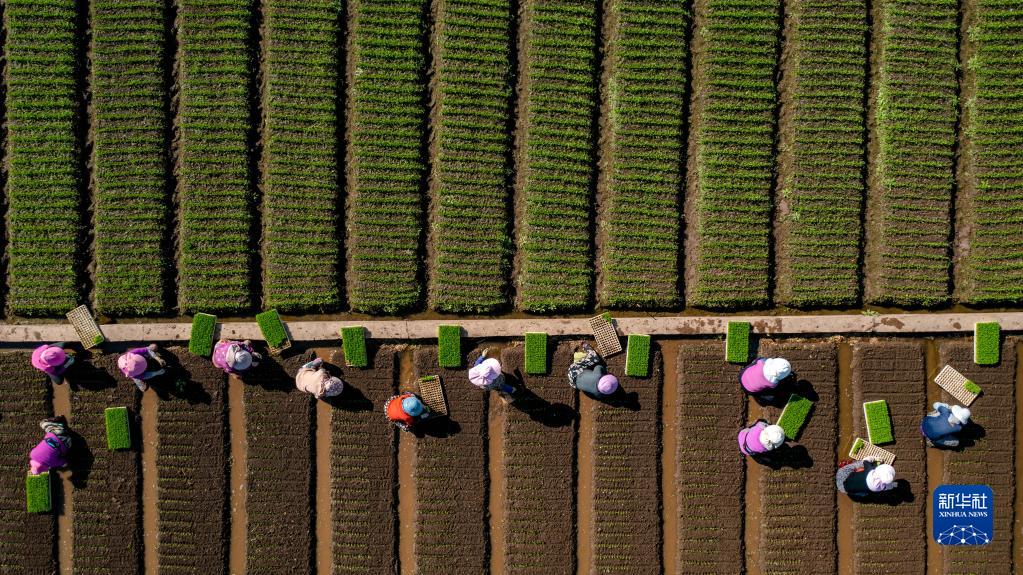2月9日,在云南省玉溪市通海县秀山街道,农民在田间劳作(无人机照片)。