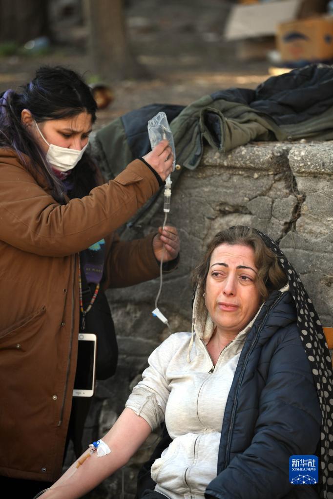 2月11日,一名女子在土耳其哈塔伊省安塔基亚市一处地震废墟附近输液。