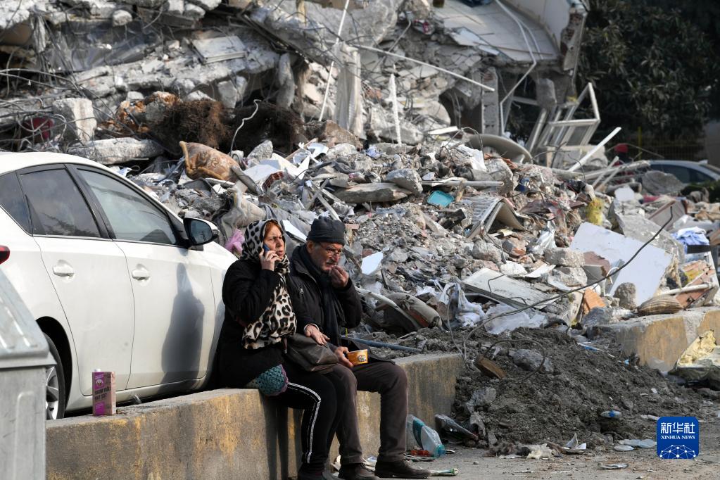 2月11日,人们坐在土耳其哈塔伊省安塔基亚市一处地震废墟旁。