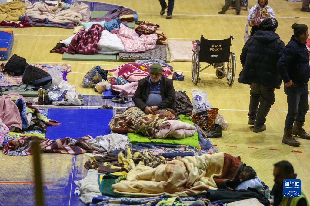 2月11日,受地震影响的人们在土耳其哈塔伊省安塔基亚市的一个体育馆休息。
