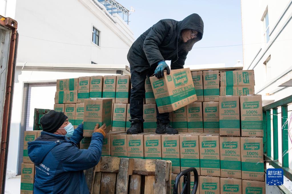 2月11日,工人在中国(黑龙江)自由贸易试验区黑河片区搬运进口货物。