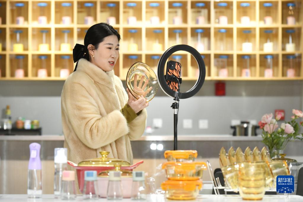 2月11日,河北省河间市一家工艺玻璃制品生产企业的工作人员在通过网络直播推介产品。