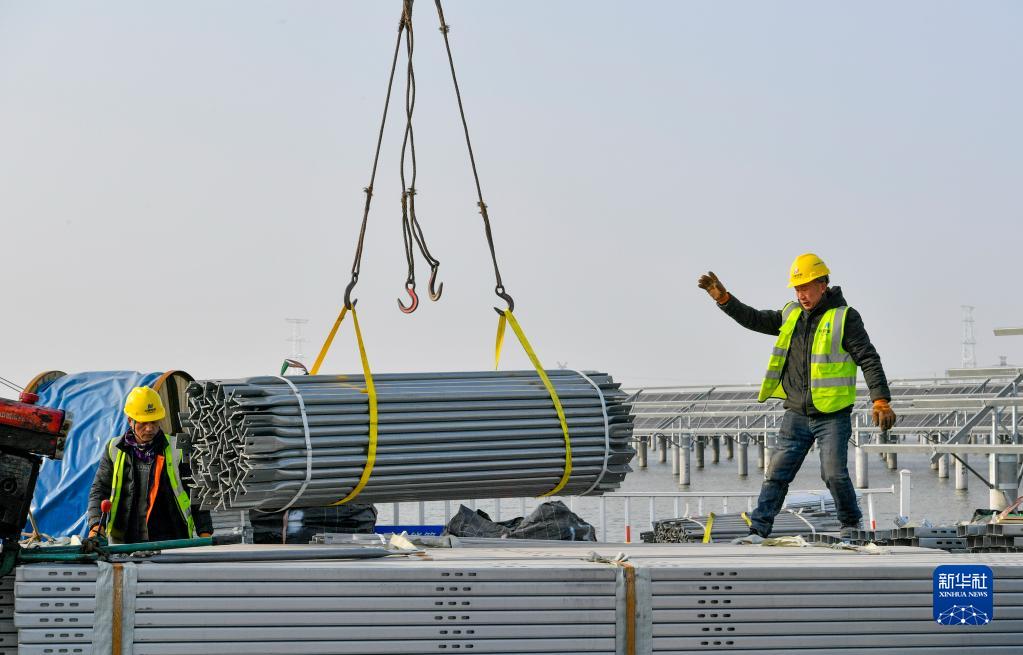 在天津滨海新区龙源海晶盐光互补项目建设现场,建设者指挥吊运光伏板结构组件(2月7日摄)。