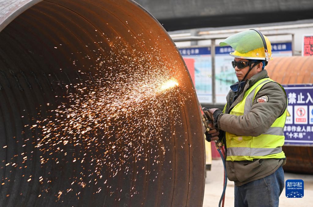 在天津地铁8号线一期工程5标项目南珠桥站施工现场,建设者进行切割作业(2月11日摄)。