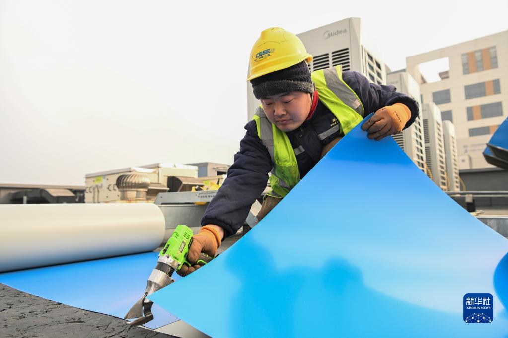 在天津“细胞谷”项目建设现场,建设者裁剪外部保温材料(2月10日摄)。
