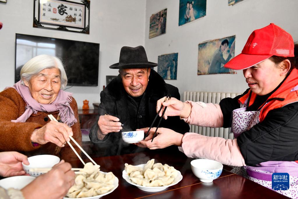 2月12日,在郓城县郓州街道王沙湾村,郓城县居家养老服务中心的工作人员刘爱雪陪魏金兰(左一)、沈宜明(中)一起吃饺子。