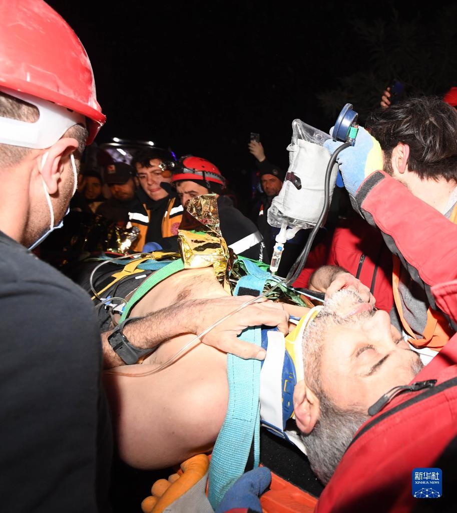 2月11日,救援人员在土耳其哈塔伊省安塔基亚市转移幸存者。