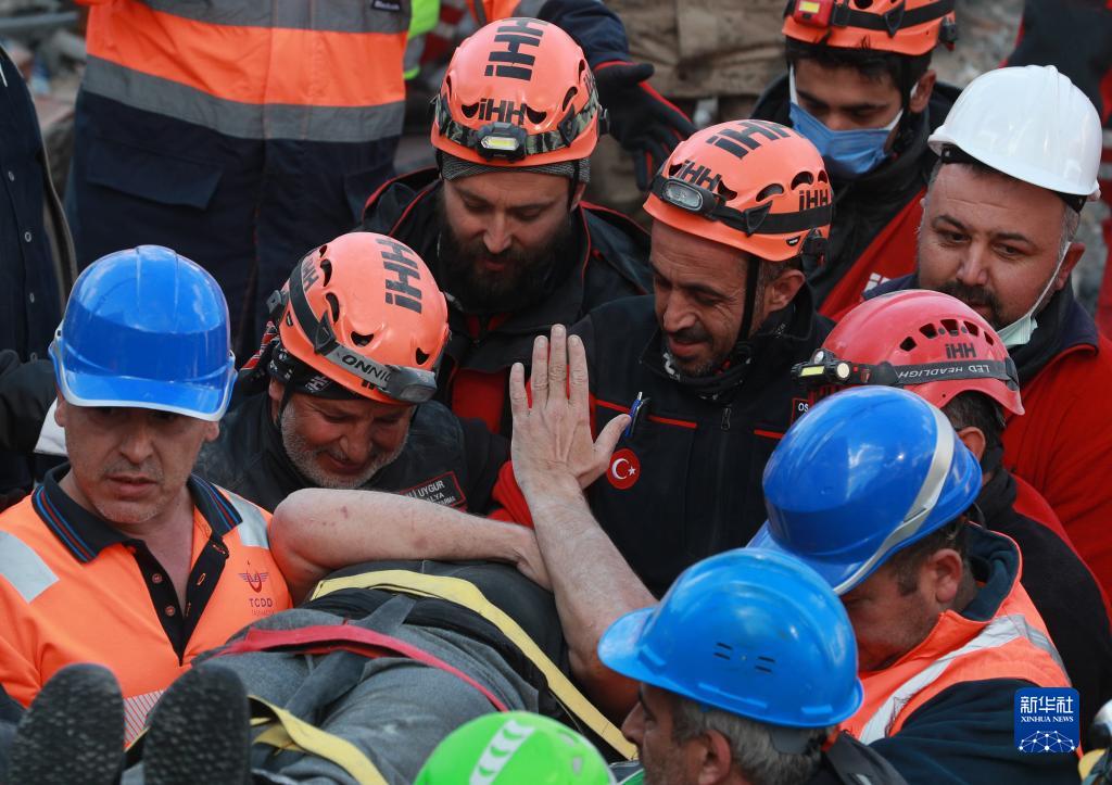 2月10日,救援人员在土耳其哈塔伊省安塔基亚市转移幸存者。